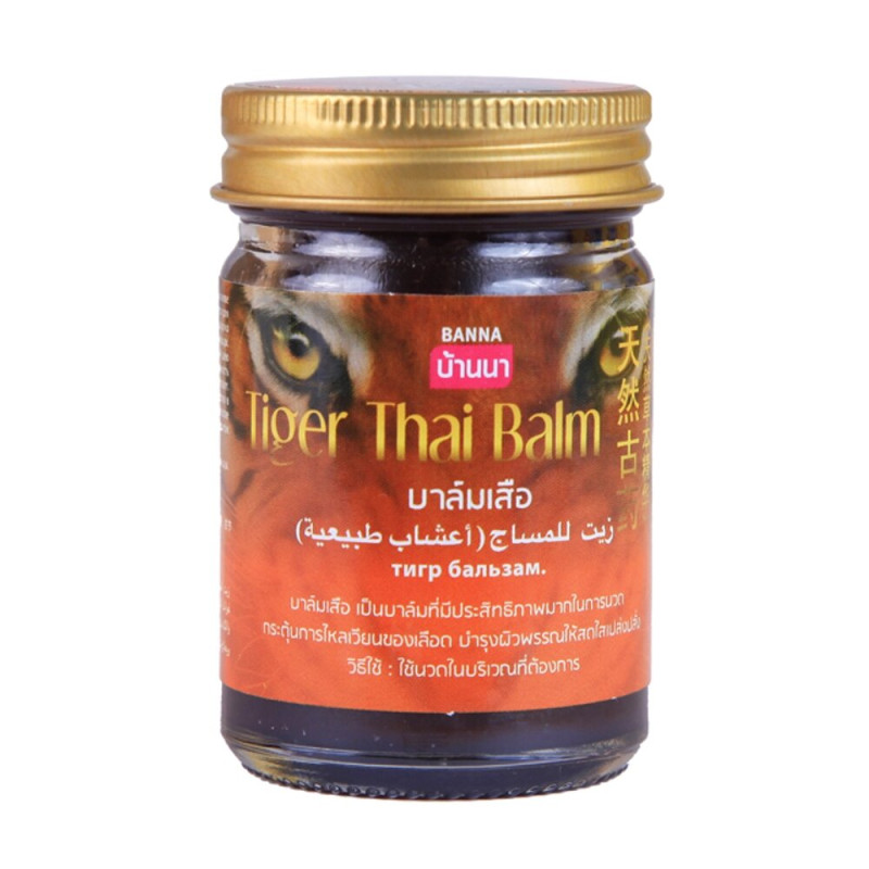 Знаменитый тайский тигровый бальзам Tiger Thai Balm Banna содержит более 100 различных компонентов целебных растений произрастающих в горных лесах Таиланда. Обладает согревающим действием. Применяется для снятия болей и воспалений в суставах, для обезболивания при прострелах, ишиасе, подагре. Ускоряет сращивание костей при переломах. Используется для снятия боли при травмах (ударах, растяжениях, перенапряжениях и пр.), используется для разогрева мышц перед занятием спортом. Ускоряет рассасывание гематом. Бальзам быстро снимает раздражение после укусов насекомых. Используется для ингаляций, для растирания груди и спины при простуде и кашле. Тигровый бальзам широко применяется для растирания конечностей при онемении и параличе.