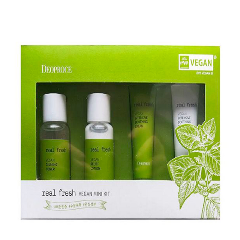 Набор DEOPROCE Real Fresh Vegan Mini Kit мини средств веган-линии для ухода за кожей лица с растительными экстрактами максимально освежает и оздоравливает кожу.