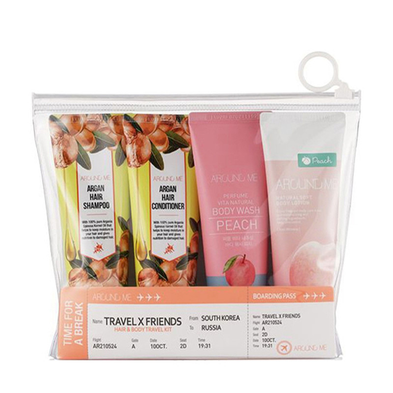 Набор дорожный Around Me Travel X Friends от южнокорейского бренда Welcos содержит эффективные натуральные эффективные средства для ухода за телом и волосами.