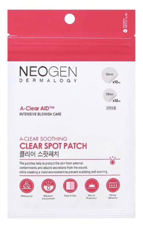 Один из самых лучших и удобных способов быстро избавиться от надоедливого прыщика. Компания Neogen создала ультра тонкие, гидроколлоидные патчи от прыщей, которые способствует лечению акне и заживлению шрамов, а также защищают воспалённую кожу от внешнего воздействия. A-CLEAR Soothing Clear Spot Patch вытягивает гной и мягко лечит поврежденный участок. Водостойкий, прочно прилипает и держится на протяжении всего дня. Средство позволяет защитить поврежденный участок от попадания косметики, грязи и пыли.