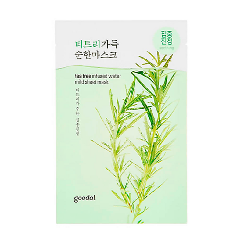 • Тканевая маска с чайным деревом и солодкой Goodal Tea Tree Infused Water Mild Sheet Mask успокаивает и снимает раздражение, увлажняет, уменьшает жирный блеск и отлично подходит для жирной, комбинированной и чувствительной кожи.