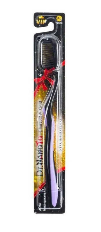 Двухрядная зубная щетка с древесным углем и наночастицами золота. Первый ряд закругленных щетинок великолепно полирует эмаль, а второй ряд тонких и удлиненных щетинок отлично очищает все труднодоступные места, межзубные промежутки и участки между зубами и десной. Ионы золота и частицы активированного бамбукового угля убивают 99.9% кишечной палочки (Escherichia coli). В щетках Dr.NanoTo наночастицы золота вплавлены в щетинки, а не нанесены на поверхность напылением.