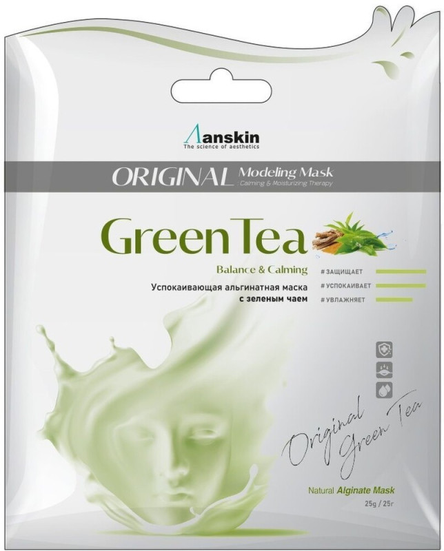 • Альгинатная маска с зелёным чаем Anskin Modeling Mask Green Tea For Balance & Calming — балансирующее и успокаивающее средство, идеально подходящее для ухода за чувствительной, проблемной, тусклой и сухой коже. Сохраняет кожу молодой, с чистым, ясным тоном. Полифенолы зеленого чая оказывают противовоспалительное и антибактериальное действие, предотвращают окисление кожи, улучшают микроциркуляцию крови, снимают отечность.