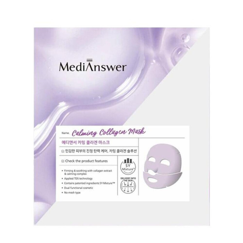 Это продукт для чувствительной кожи, забота о которой начинается с беспокойства об эластичности. Это косметика двойного назначения. Для успокоения чувствительной кожи и снижения эластичности кожи достаточно одной маски. По мере впитывания создается ощущение тонкости и прозрачности. MediAnswer применяет собственную запатентованную технологию TDS для эффективной доставки активных ингредиентов в кожу. Используя только 100% французский коллаген плотностью 500 Да, он легко впитывается в кожу. MediAnswer использует коллаген с разной поглощающей способностью благодаря его размеру 500 Да, что составляет 1/33 334 размера пор. Содержит азулен и запатентованный ингредиент для успокоения кожи.